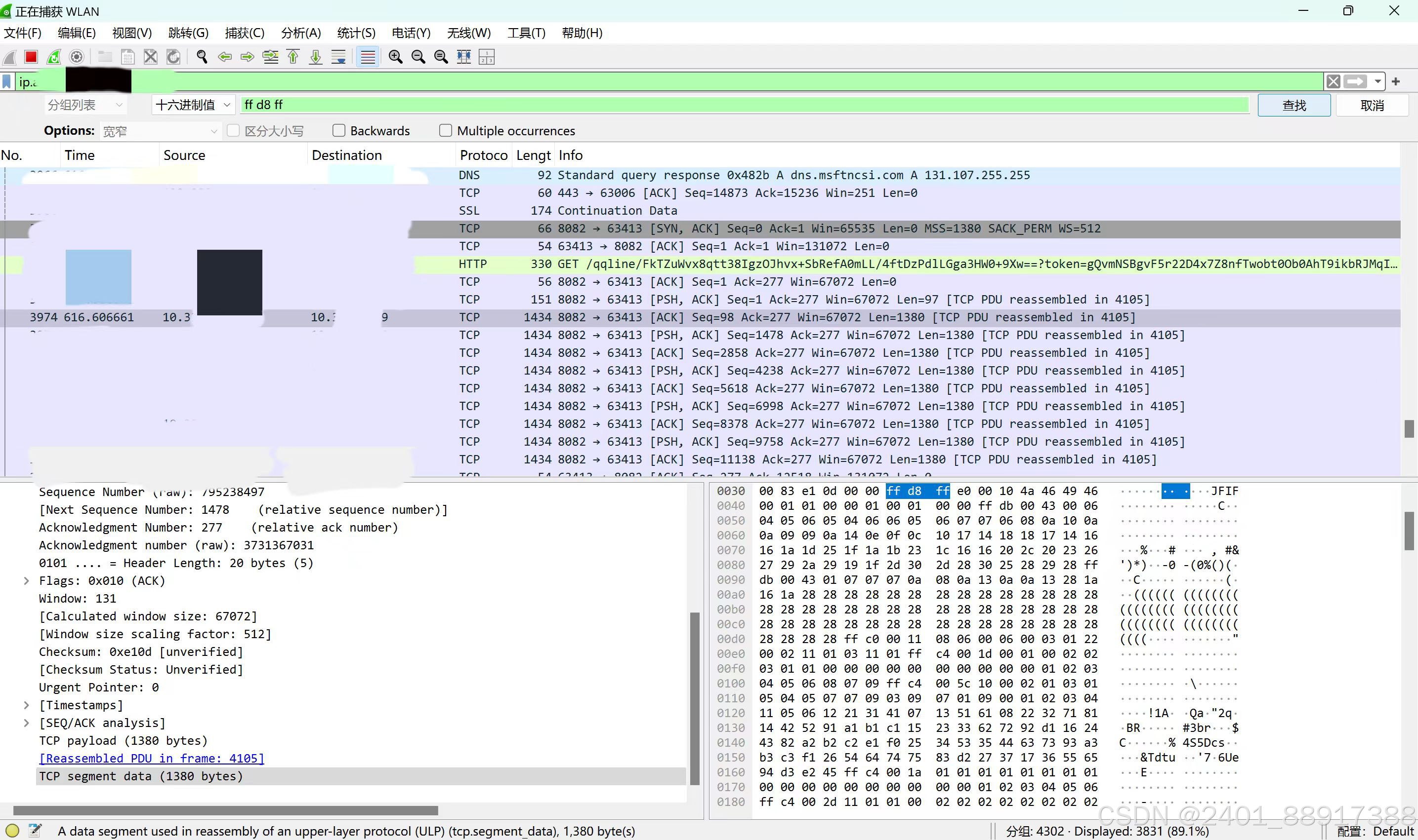 搜索分组列表的十六进制值的ff d8 ff,这个分组也带有TCP字样。