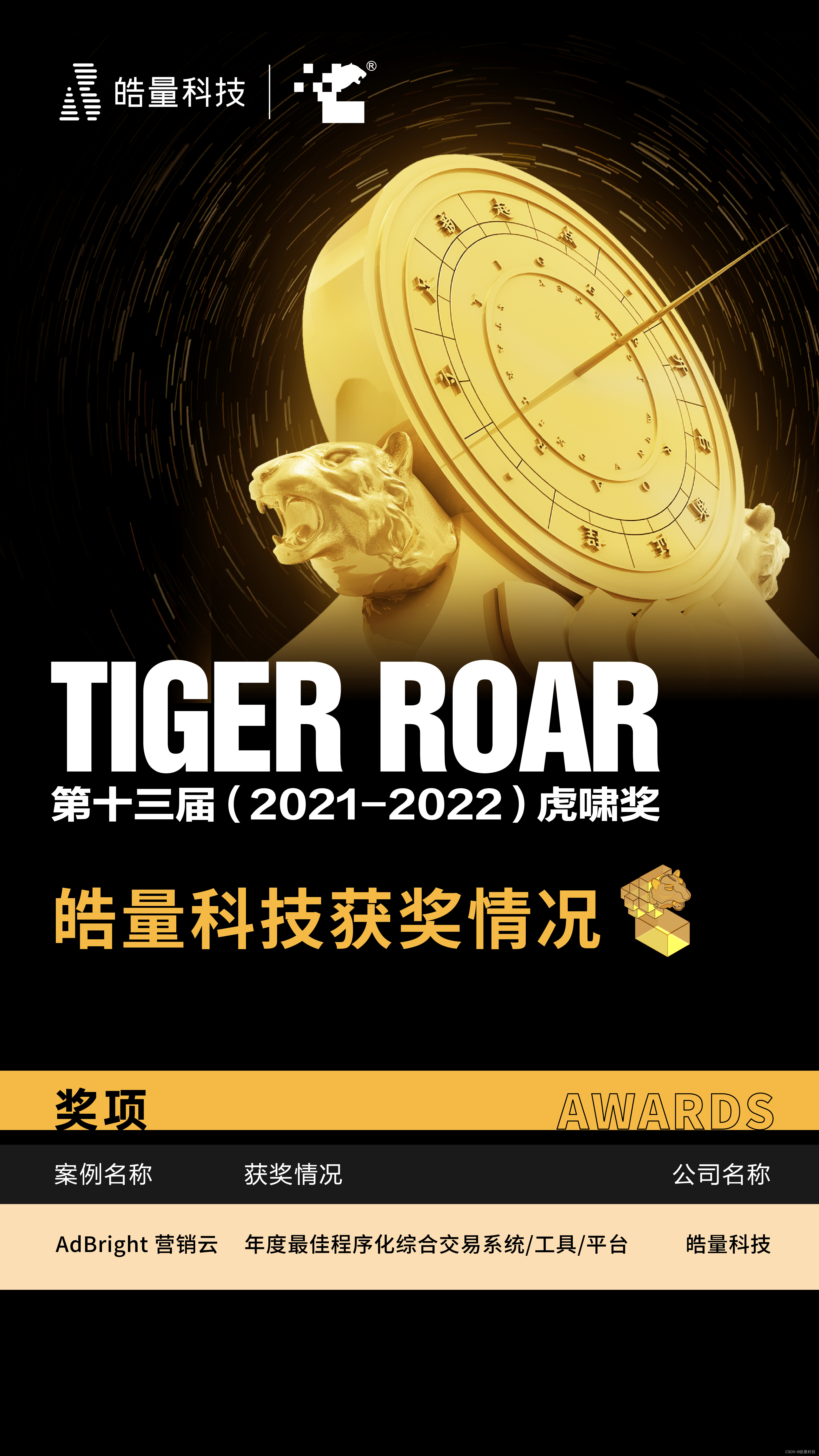 2022年,继IAI传鉴国际广告奖和TopDigital创新营销奖,皓量科技再获虎啸奖!多次获得行业奖项的背后,是行业对皓量科技的营销技术实力的认可!