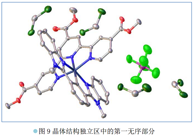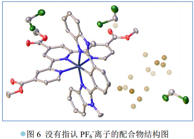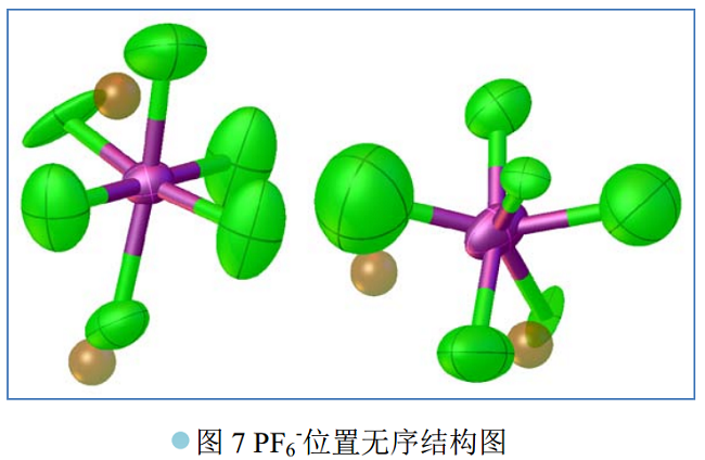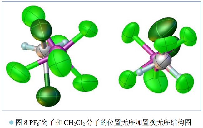 通过仔细分析发现,虽然对 PF6-离子做了位置无序处理,即将 1 个 PF6-离子裂分于 2 个位置上,但是,每个位置上都有两个较高的残峰, 参看图 7 中的金色小球。考虑到培养单晶使用的溶剂为 CH2Cl2, 因此,推测剩余的残峰归属于无序的 CH2Cl2 分子。 于是,这个无序模型进一步改进为 PF6-离子和 CH2Cl2 分子的位置无序加置换无序。 当在结构精修中引入这个双重无序模型后,对 PF6-和 CH2Cl2 的键长键角无需施加任何限制, 结构就自然合理, 参看图 8,且最终的一致性因子 R1 也明显下降,见表一。