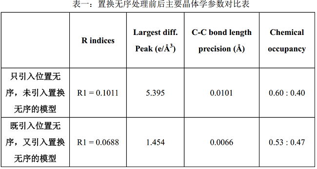 综上所述,本文列举了溶剂分子置换无序的两个案例。 案例一的溶剂只存在置换无序,没有位置无序,且溶剂分子的空间取向呈确定性,其原因是溶剂分子与主体分子间存在 Cl⋅⋅⋅π分子间相互用;案例二的抗衡阴离子和溶剂分子出现了位置无序加置换无序的双重无序,原因是晶体堆积较松散,空位较大所致。