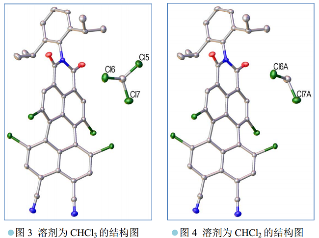 进一步考察这个无序结构,发现从空间对称性的角度看, CH2Cl2 的两个 Cl原子 Cl6A 和 Cl7A 可能出现 3 种空间取向,第一种取向是现有位置 Cl6 和 Cl7,另外两种可能的取向分别是位置 Cl5 和 Cl6,以及位置 Cl5 和 Cl7,为什么后两种取向没有出现呢? 其原因可能是,产物分子存在大π键,且距离 Cl6( Cl6A)和 Cl7( Cl7A) 较近,分别为 3.371Å 和 3.702Å(图 5), 因此,选择第一种取向使得 CH2Cl2 的两个 Cl 原子与主体分子间存在更强的 Cl⋅⋅⋅π分子间相互作用。