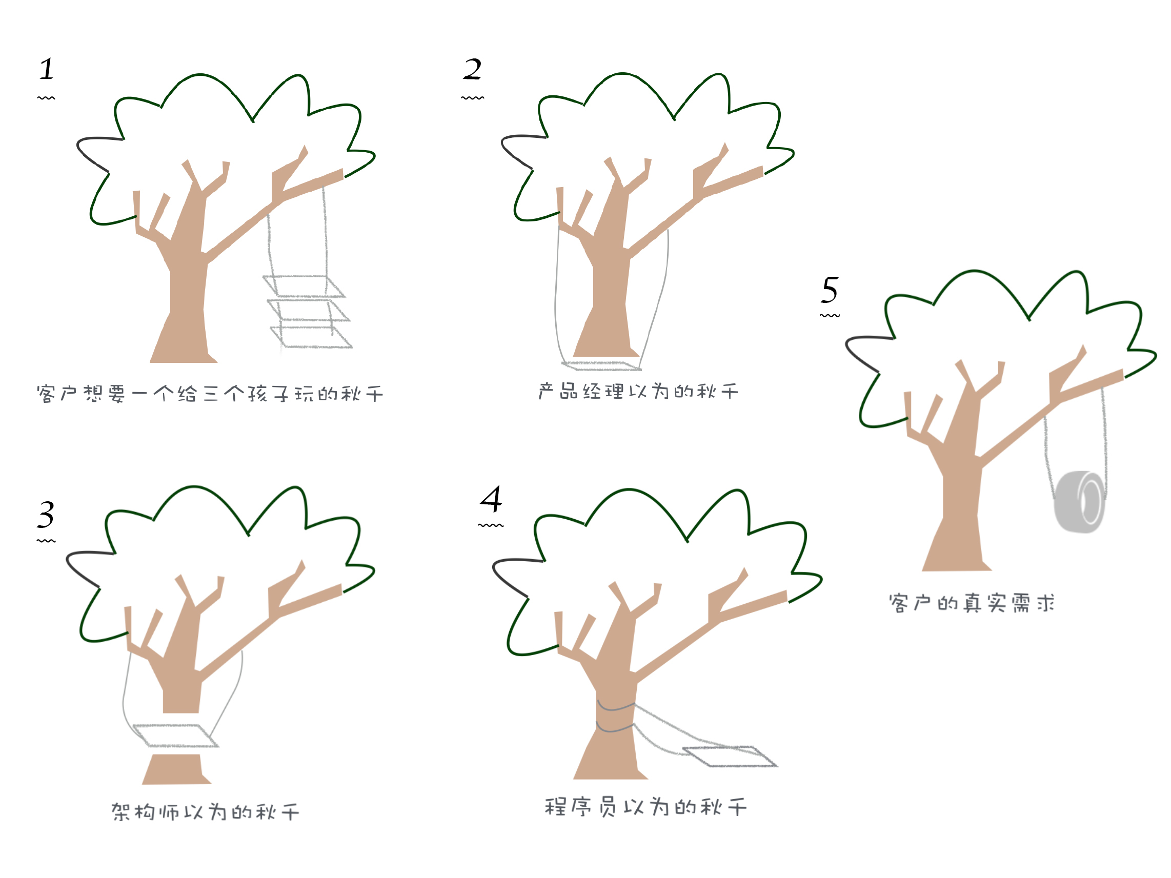 通常是一步错步步错,就像下面的秋千图:客户想要一个给三个孩子玩的秋千;产品经理以为就是一个板子加两绳子就行;架构师发现除非把树截开,否则秋千没法荡起来的;程序员以为用绳子和板子连一起就完事了;而真正满足客户需求的,也就只要在绳子上挂个轮胎而已!
