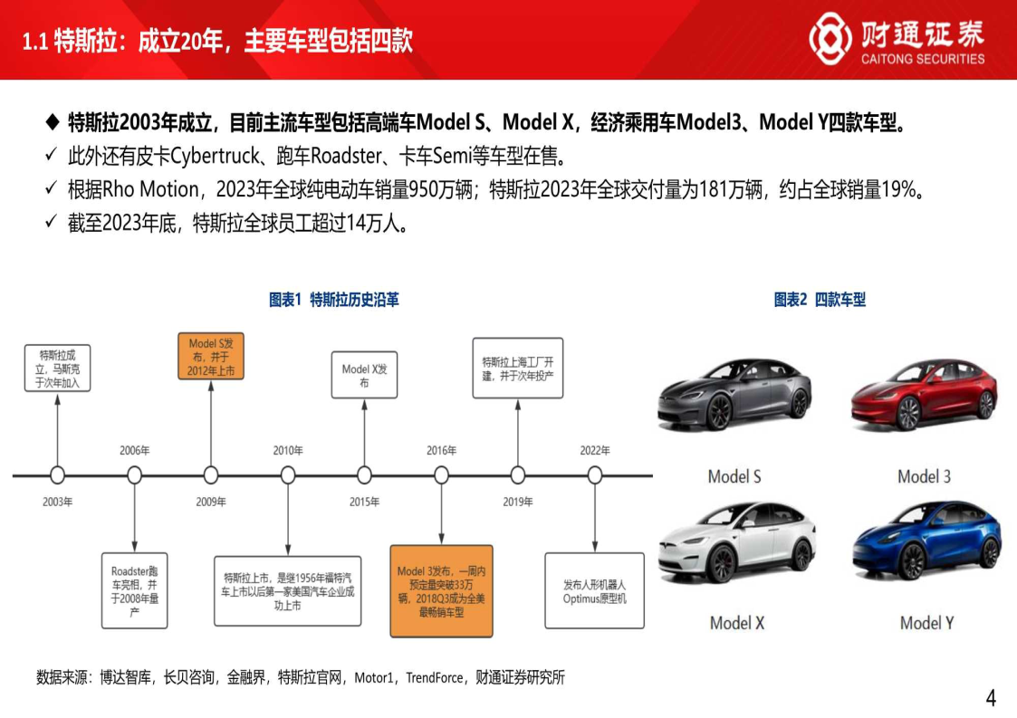 根据Rho Motion,2023年全球纯电动车销量950万辆;特斯拉2023年全球交付量为181万辆,约占全球销量19%。截至2023年底,特斯拉全球员工超过14万人。