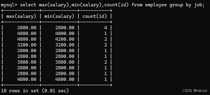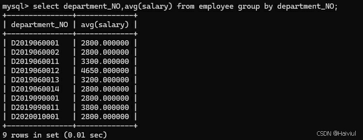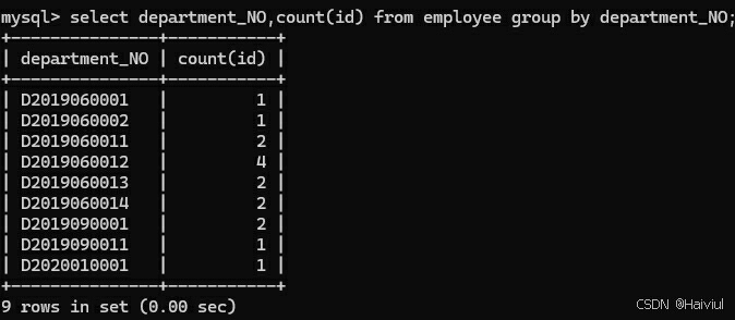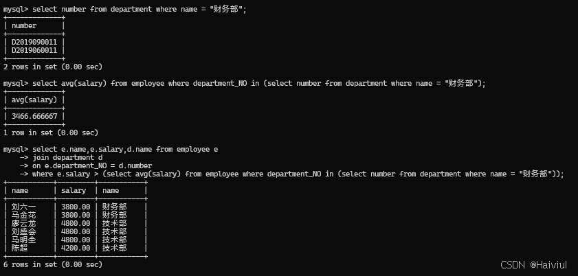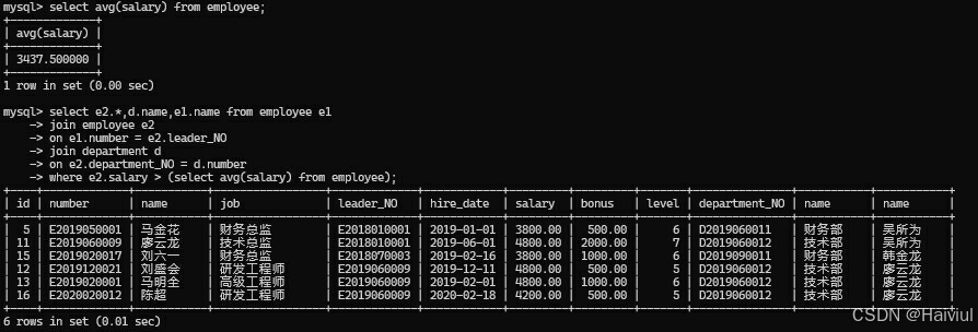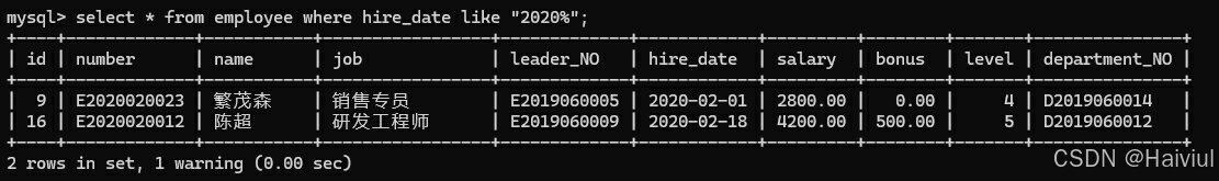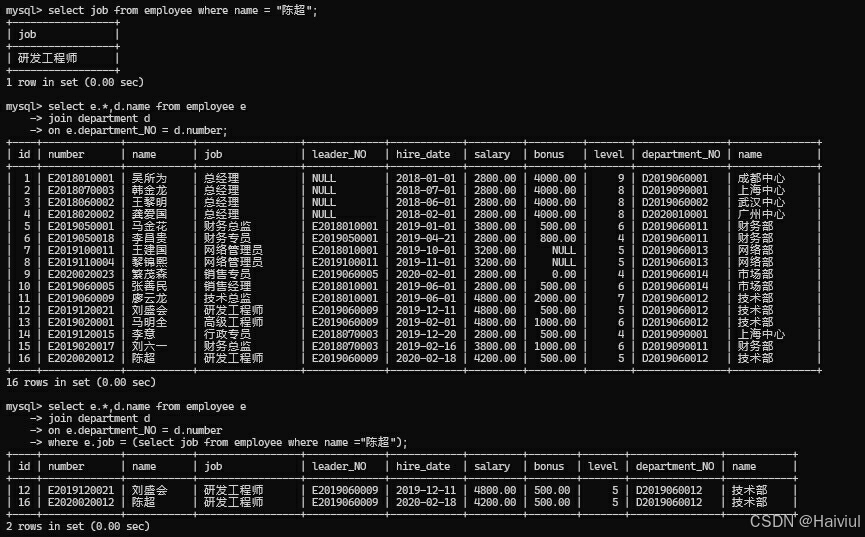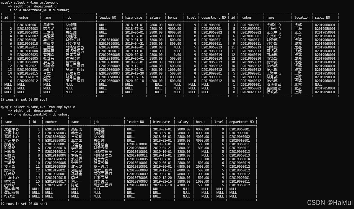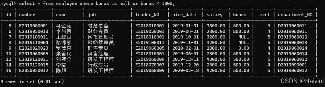 | 8 | E2019110004 | 黎锦熙 | 网络管理员 | E2019100011 | 2019-11-01 | 3200.00 | NULL | 5 | D2019060013 |
