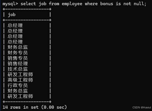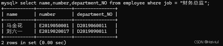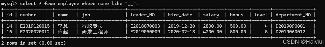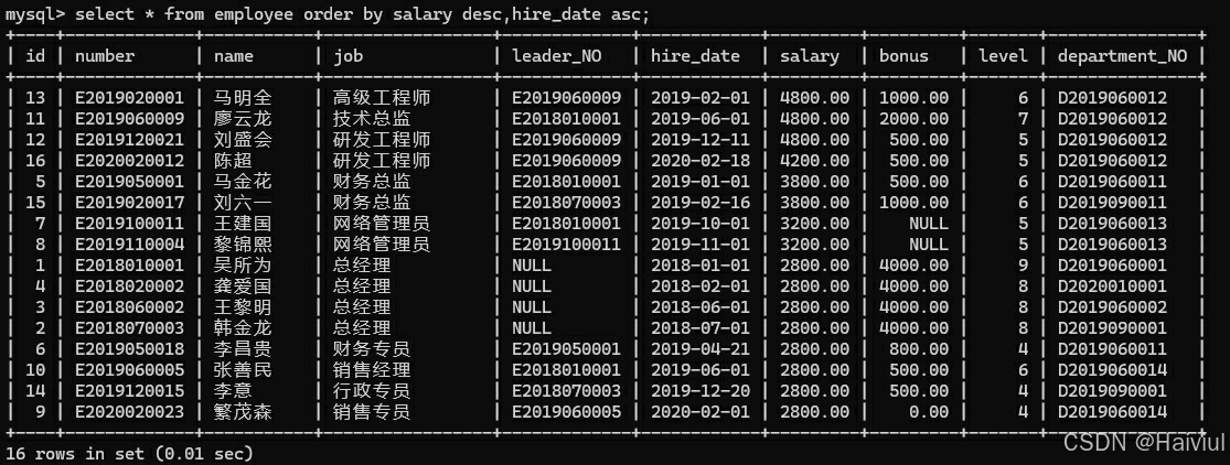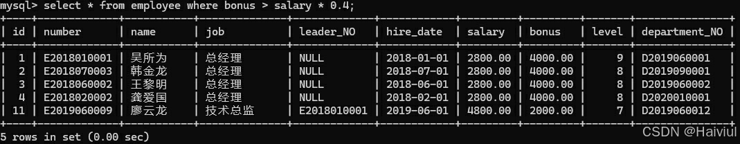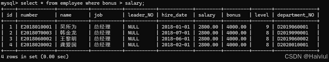 | 2 | E2018070003 | 韩金龙 | 总经理 | NULL | 2018-07-01 | 2800.00 | 4000.00 | 8 | D2019090001 |