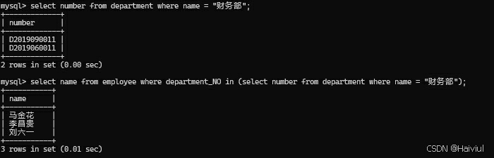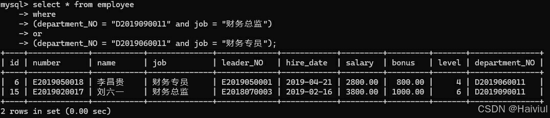 5 找出部门编号为D2019090011中所有财务总监,和部门编号为D2019060011中所有财务专员的详细资