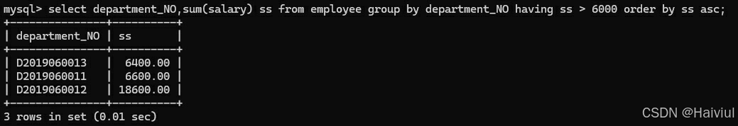 17. 统计各部门工资总和,显示部门编号和该部门雇员的月工资的总和,并且要满足该部门雇员的月工资合计