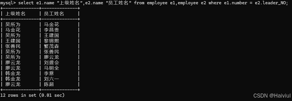 1. 列出所有员工的姓名及其直接上级的姓名。