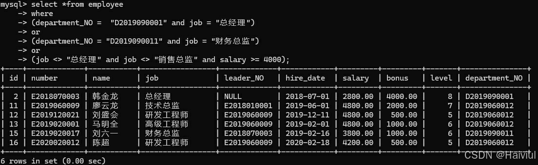 6. 找出部门编号为D2019090001中所有总经理,部门编号为D2019090011中所有财务总监,还有即不是总经理又不是销售总监但其工资大或等于4000的所有员工详细资料。