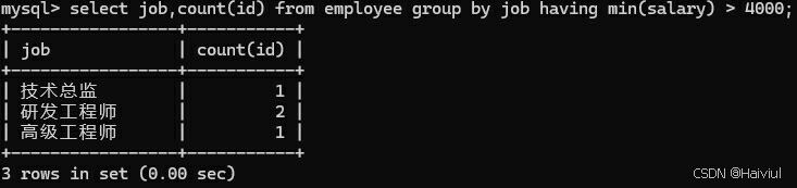 16. 列出最低薪金大于4000的各种工作及从事此工作的员工人数。