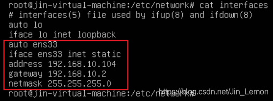 auto ens33 #网卡名 iface ens33 inet static #静态 address 192.168.10.104 #IP地址,根据个人的vmnet8网段或主机网段写 gateway 192.168.10.2 #网关 netmask 255.255.255.0 #子网掩码 -