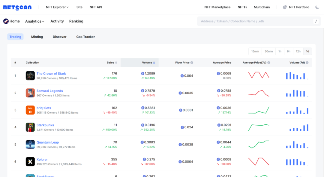 就 NFTScan 数据来看,截至 12 月 1 日,Starknet 网络上已累计发行 NFT 资产 15,009,965 枚,NFT Collection 18,111 个,产生交易记录 17,009,163 条,有过交互的钱包地址 2,468,080 个,总交易额 3,245.43 ETH。