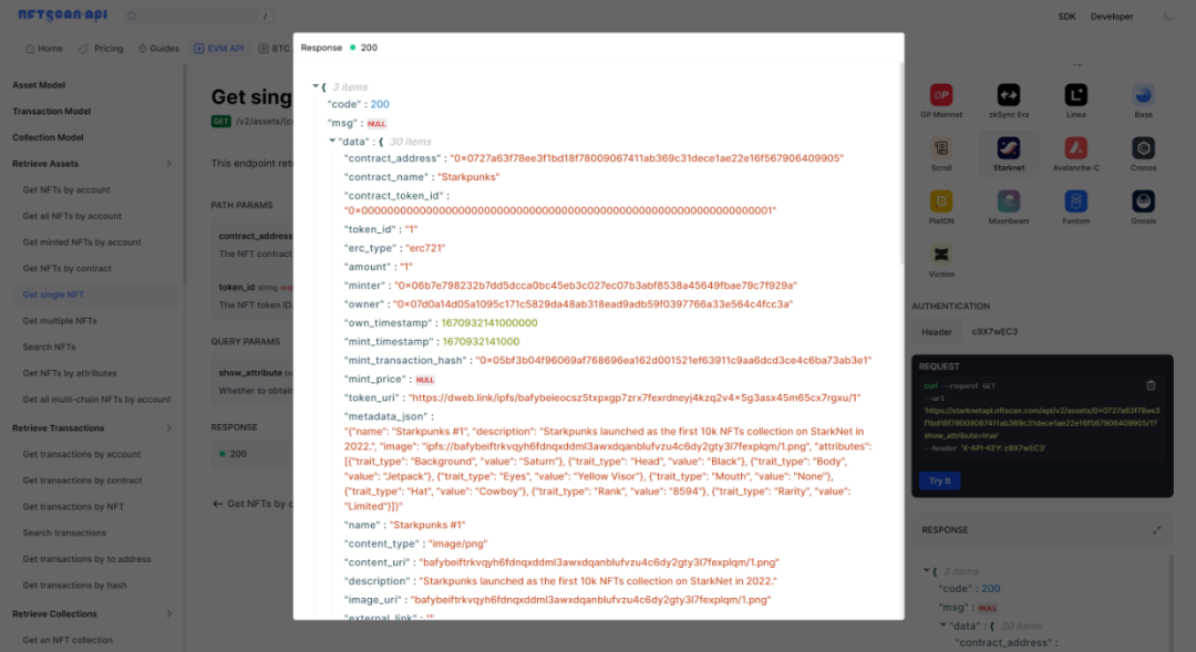 本文介绍了Starknet,一个免许可的第2层网络,以及NFTScan平台提供的StarknetAPI,包括资产、交易和收藏夹数据的检索,以及如何通过API获取NFT资产、交易记录和项目信息。NFTScan支持多种区块链,是开发者获取全链NFT数据的强大工具。