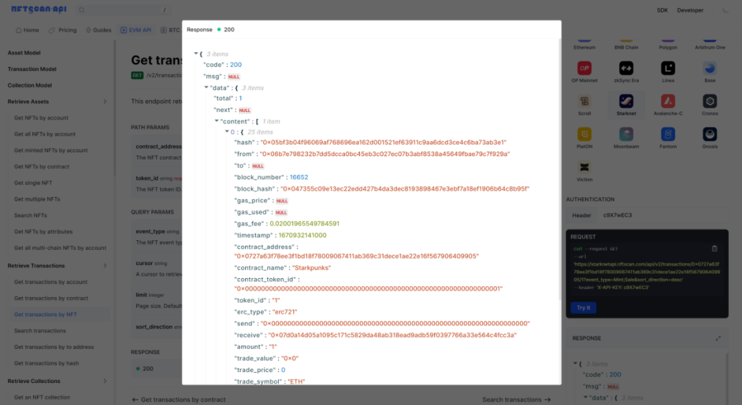 Transactions API:交易模型代表了区块链上一个 NFT 资产的全量交易数据,为开发者提供 NFT 的完整生命周期交易信息。包括 NFT 的 mint、转移、销售、和其他交易活动,为开发者提供了深入了解 NFT 资产在 Starknet 生态系统中的流动和演变过程的机会。NFTScan 不断地汇总来自各个区块链网络的 NFT 交易市场和相关交易合约信息,目前 NFTScan 已收录用于追踪和了解 NFT 市场的动态,同时也有助于开发者构建基于 NFT 的应用程序和工具。