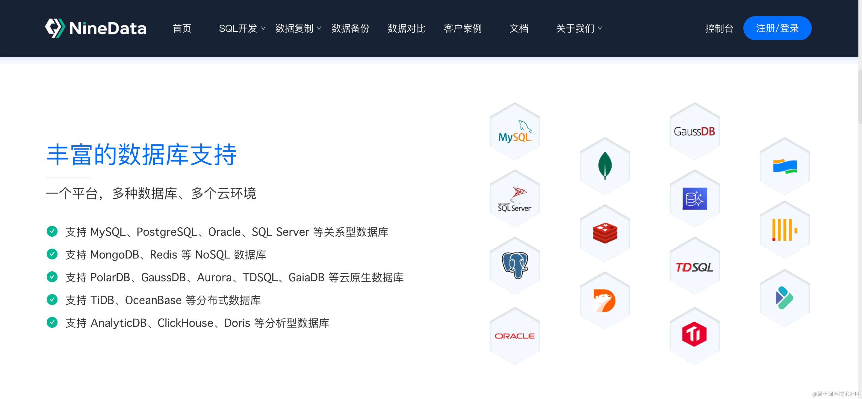 NineData的创始团队由阿里云、华为、IBM等公司资深数据库专家组成。NineData支持MySQL、Oracle、PostgreSQL、ClickHouse、Redis、MongoDB、Doris等60种主流数据源。