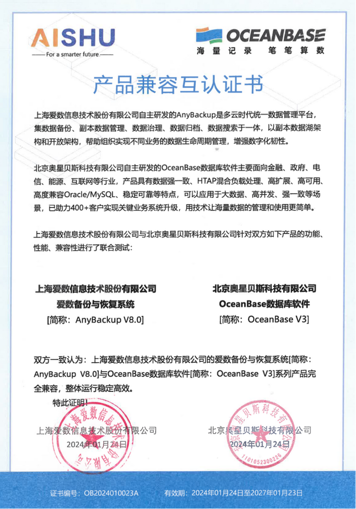 近日,OceanBase 数据库 V3 版本与上海爱数信息技术有限公司的爱数备份恢复系统 AnyBackup Family 8 完成兼容性互认证。