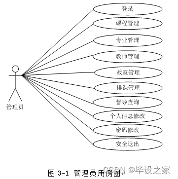 管理员登录后主要功能有课程管理,专业管理,教师管理,教室管理,排课管理,督导查询,个人信息修改,密码修改,安全退出。管理员用例如图3-1所示: