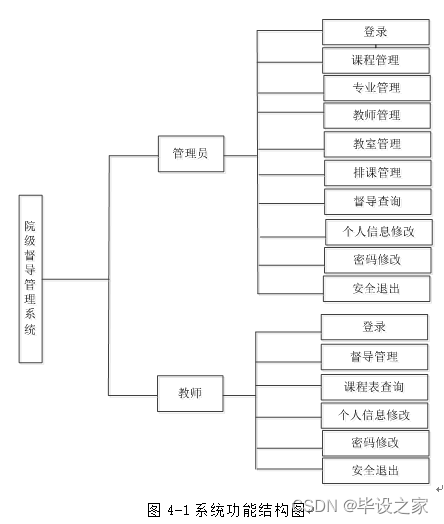 本院级督导管理系统主要包括两大功能模块,即管理员功能模块,教师功能模块。系统结构如图4-1所示