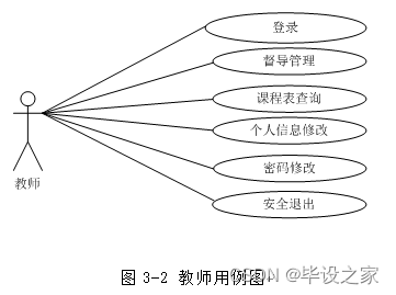 教师登录后功能有督导管理,课程表查询,个人信息修改,密码修改,安全退出。教师用例如图3-2所示: