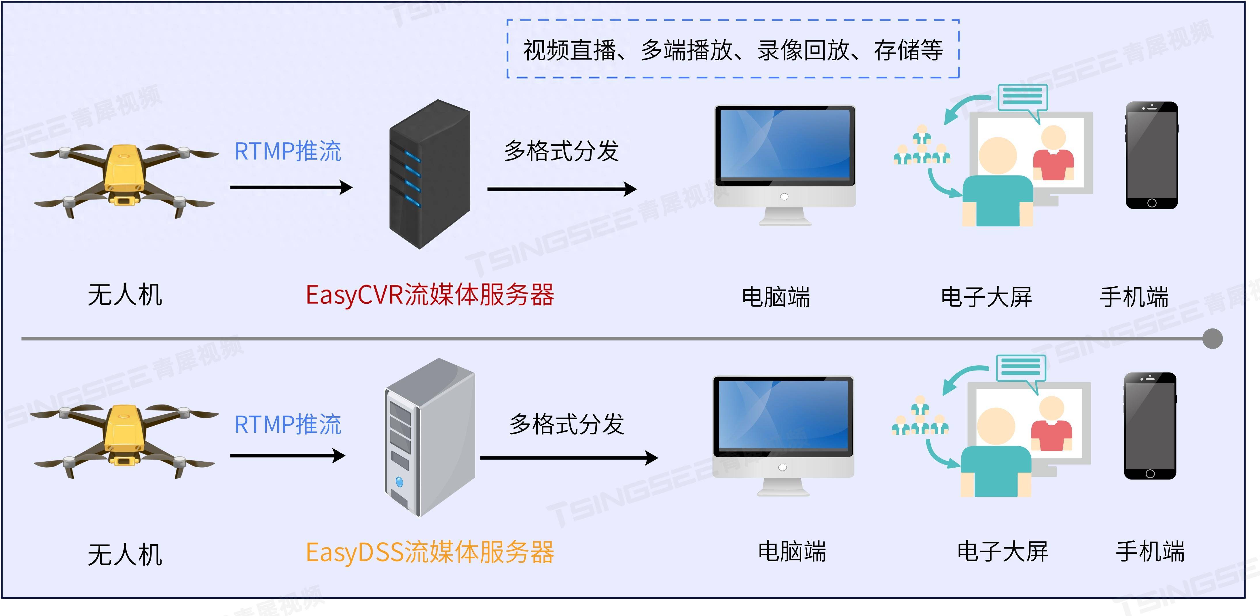 TSINGSEE青犀安防视频管理平台EasyCVR基于云边端一体化架构,能支持无人机接入与视频推流、视频播放、录像与回放等视频能力。视频汇聚EasyCVR平台能在复杂的网络环境中快速接入无人机设备,可利用RTMP的方式推流到平台,经平台处理后,推流视频可以转码为多格式向公网发布,包括:RTSP、RTMP、HLS、FLV、WebRTC、fmp4等,也能在多种展示设备上观看无人机传输的视频图像。