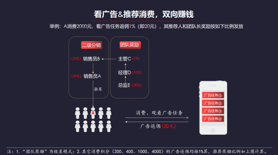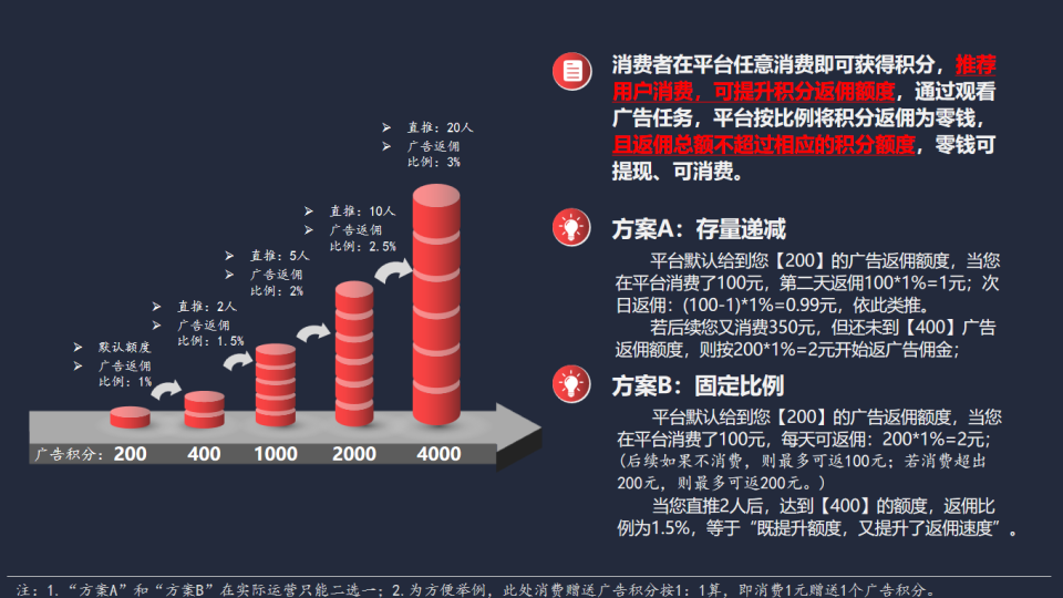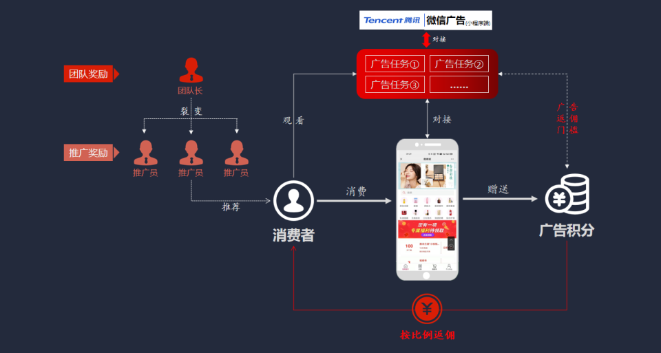 在这种模式中,消费者在平台上任意消费即可获得积分,并通过观看平台上的广告任务,平台会根据消费者剩余积分按比例返佣为零钱,零钱可以提现或消费。同时,广告主可以通过投放广告宣传自己的商品或服务,并通过与消费者的互动来提升销售额和用户满意度。
