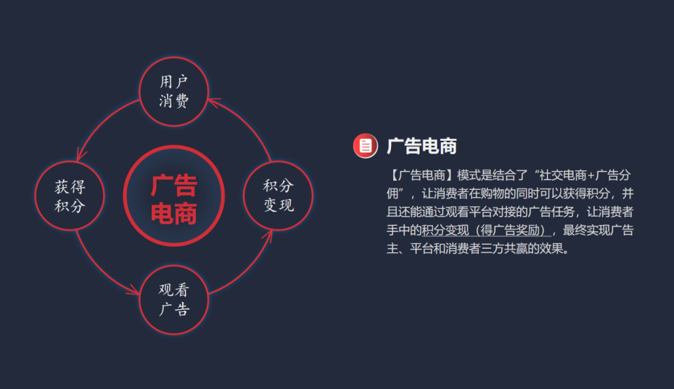 广告电商模式的核心在于将广告与电子商务相结合,通过大数据技术分析用户行为,向不同用户提供个性化的广告和消费积分。其具体应用模式主要有以下几种: