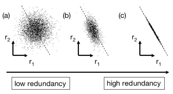 如果如图(a),则说明两组数据相关性低(或者说low redundancy);如果如图(c),则说明两组数据的相关性高,也就是high redundancy,因为我们基本上可以认为