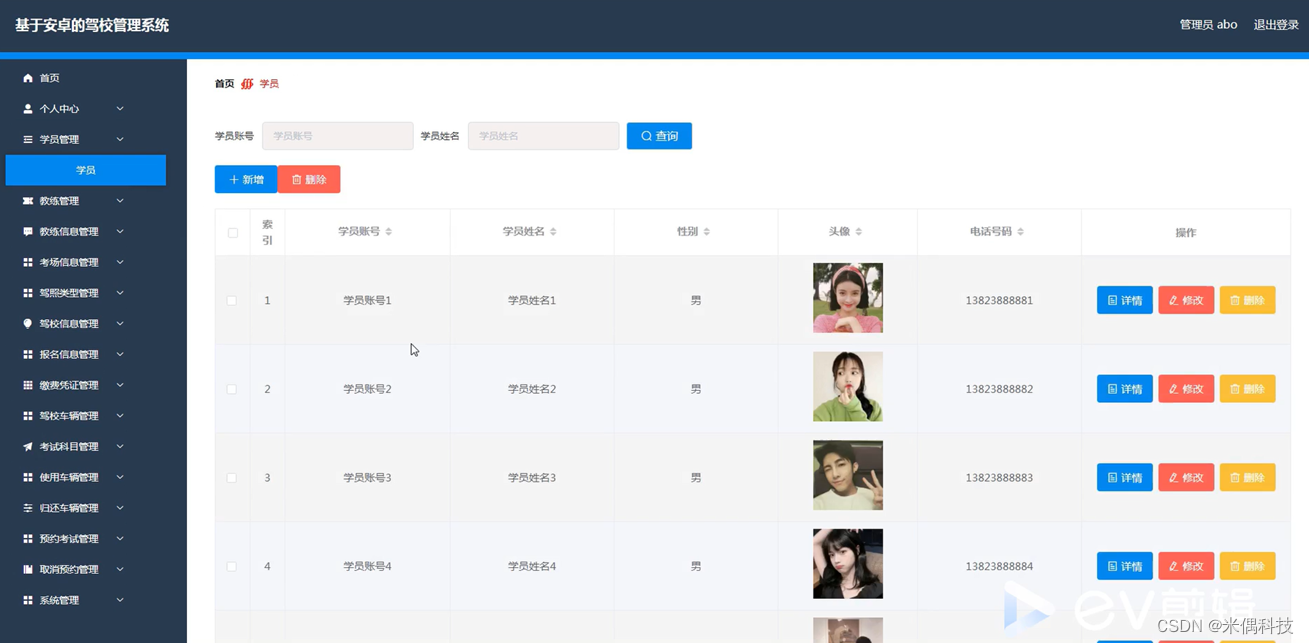 学员管理,在学员管理页面通过输入学员账号、学员姓名、性别、头像、电话号码等内容进行详情、修改、删除等操作,如图5-9所示。