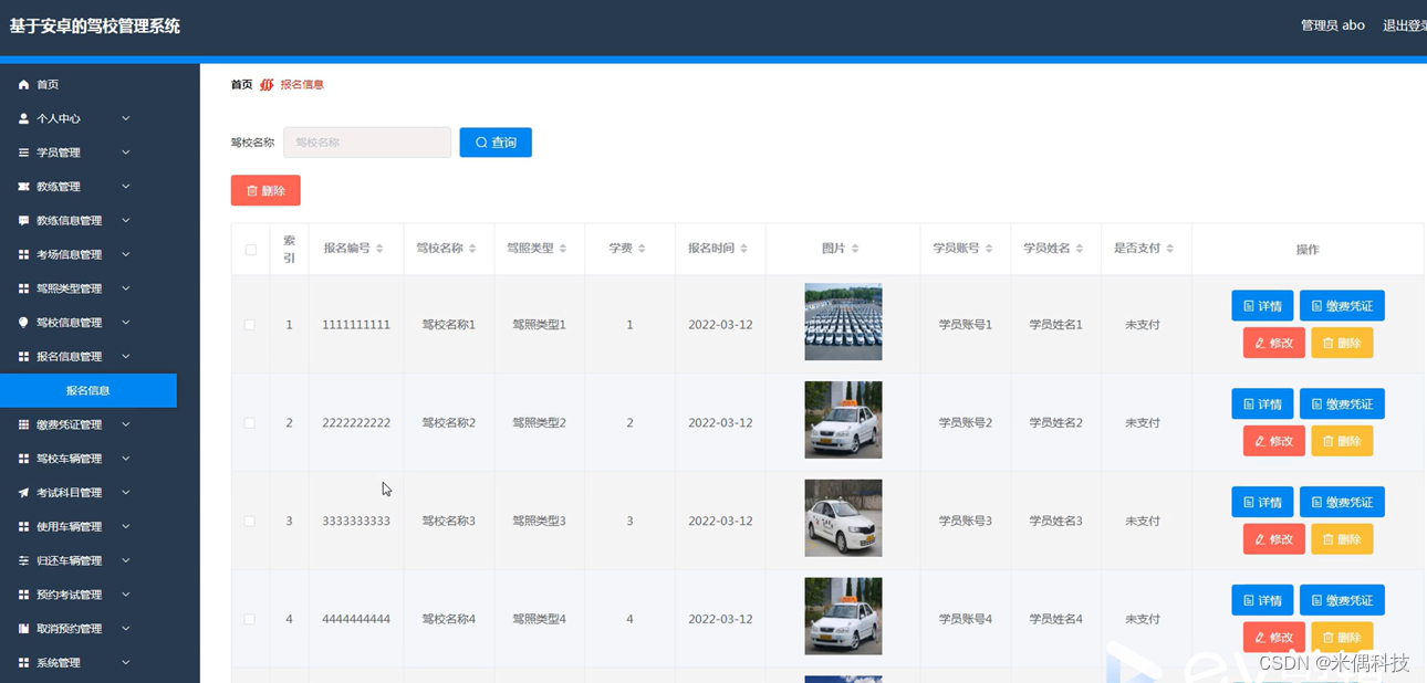 报名信息管理,在报名信息管理页面可以查看报名编号、驾校名称、驾照类型、学费、报名时间、图片、学员账号、学员姓名、是否支付等内容、进行详情、缴费凭证、修改、删除等操作,如图5-14 所示。