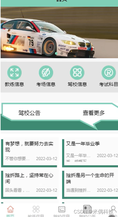 学员登录进入系统首页可以查看首页、教练信息、驾校信息、驾校公告、我的等功能模块,并可对功能模块进行相应操作,如图5-3所示。
