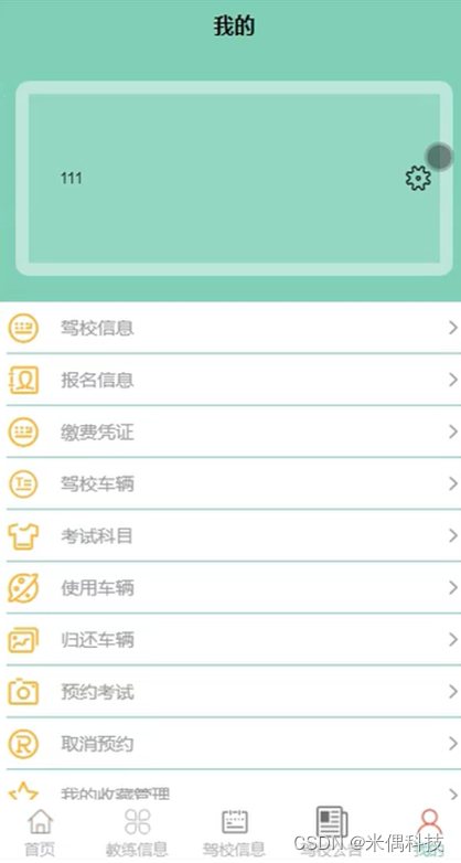 我的,在我的页面查看驾校信息、报名信息、缴费凭证、驾校车辆、考试科目、使用车辆、归还车辆、预约考试、取消预约、我的收藏管理等操作,如图5-4所示。