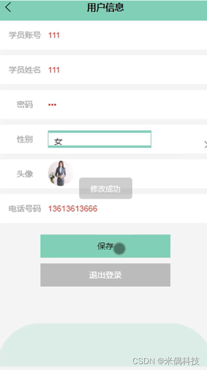 用户信息,在用户信息页面填写联学员账号、学员姓名、密码、性别、头像、电话号码等内容,驾校保持、退出登录,如图5-5所示。