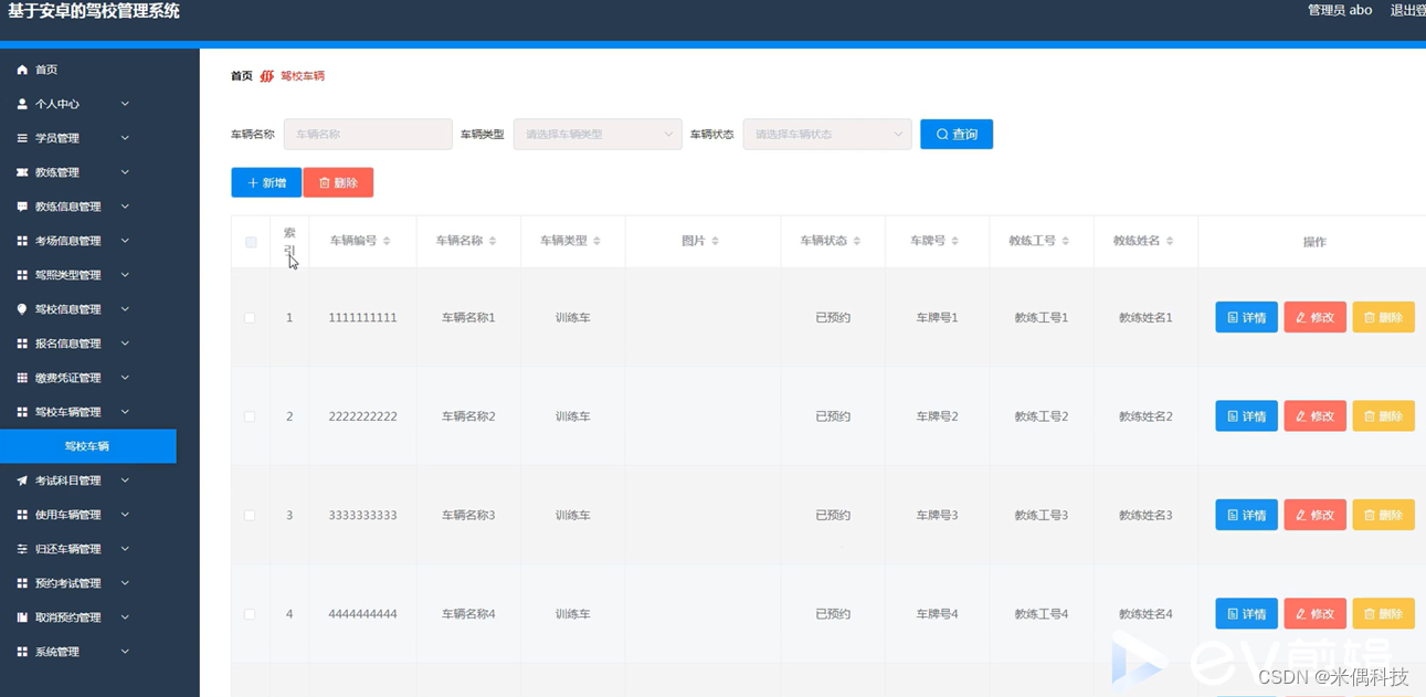 驾校车辆管理,在驾校车辆管理页面可以查看车辆编号、车辆名称、车辆类型、图片、车辆状态、车牌号、教练工号、教练姓名等内容、进行详情、修改、删除等操作,如图5-15 所示。