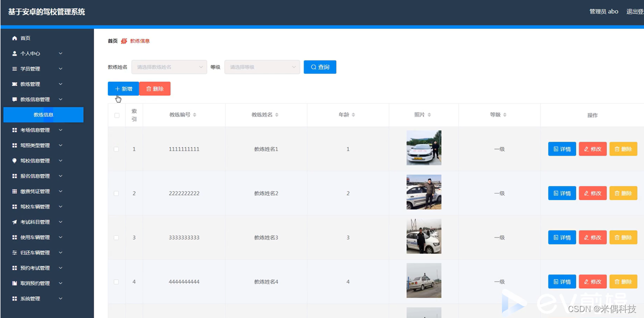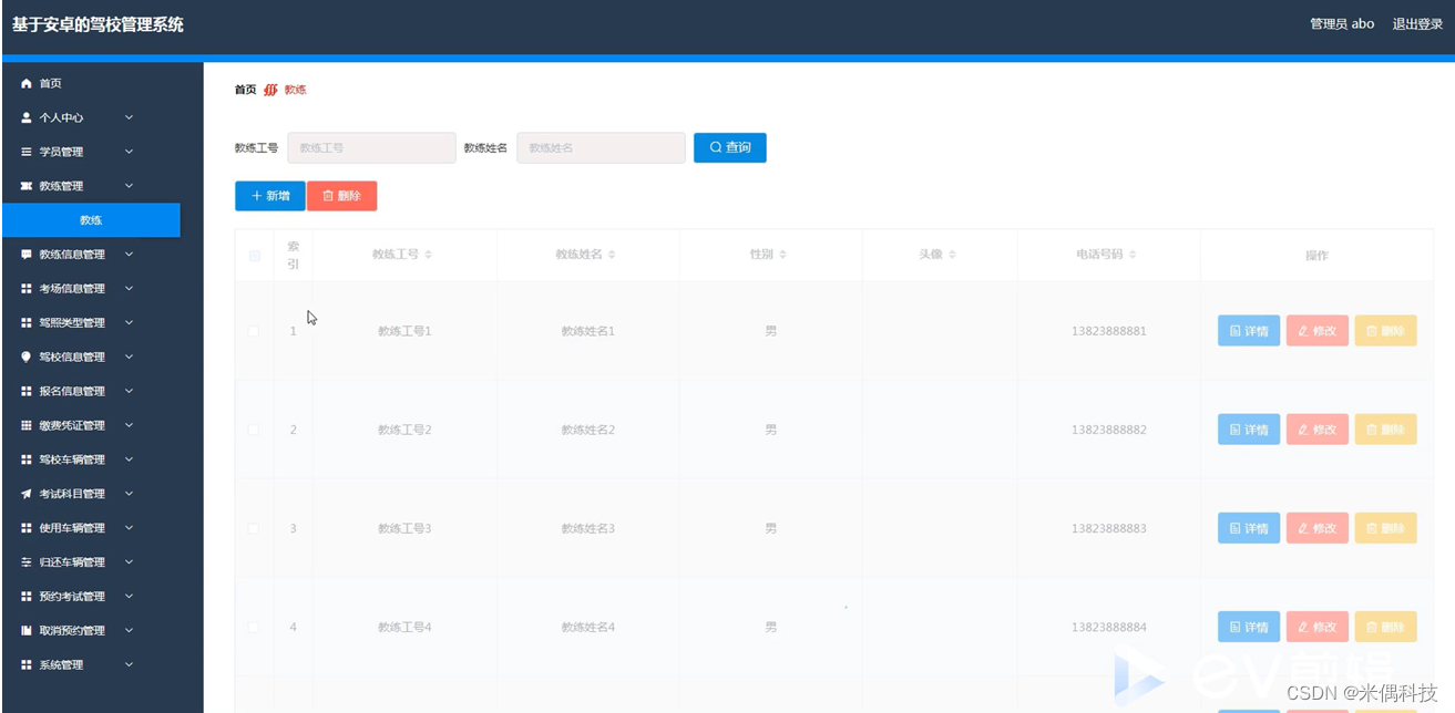 教练管理,在教练管理页面可以查看教练工号、教练姓名、性别、头像、电话号码等内容,进行详情、修改、删除操作,如图5-10所示。