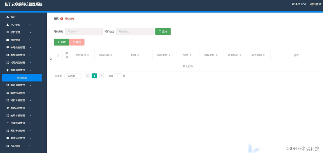 驾校信息管理,在驾校信息管理页面可以查看校编号、驾校名称、封面、驾照类型、学费、驾校地址、咨询电话、成立时间等操作,如图5-13 所示。