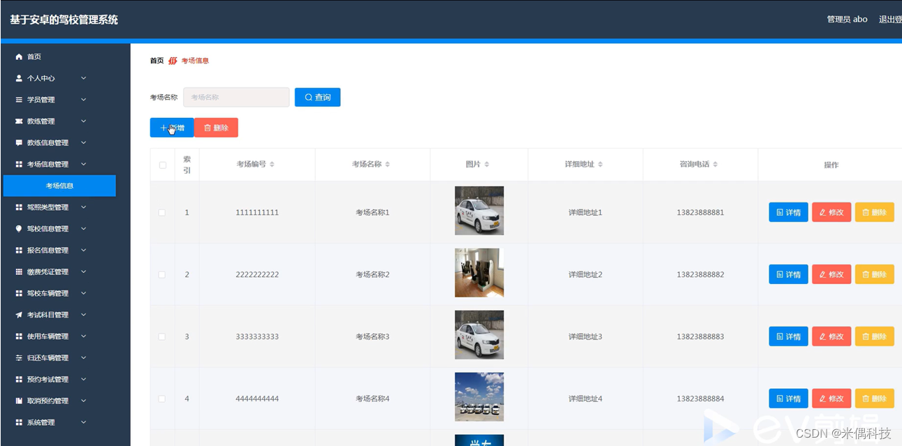 考场信息管理,在考场信息管理页面可以查看考场编号、考场名称、图片、详细地址、咨询电话等详细信息,进行详情、修改、删除等操作,如图5-12所示。