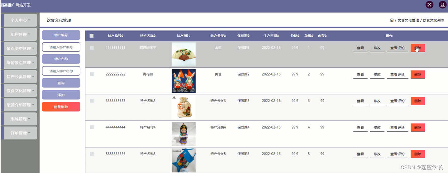 饮食文化管理,在饮食文化管理页面可以查看特产编号、特产名称、特产图片、特产分类、保质期、生产日期、价格、单限、库存等内容,并可根据需要对饮食文化管理进行修改、删除等操作,如图5-5所示。