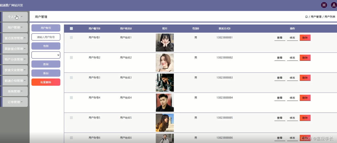 用户管理,在用户管理页面可以查看用户账号、用户姓名、照片、性别、联系方式等信息,并可根据需要对用户管理进行修改、删除等操作,如图5-4所示。