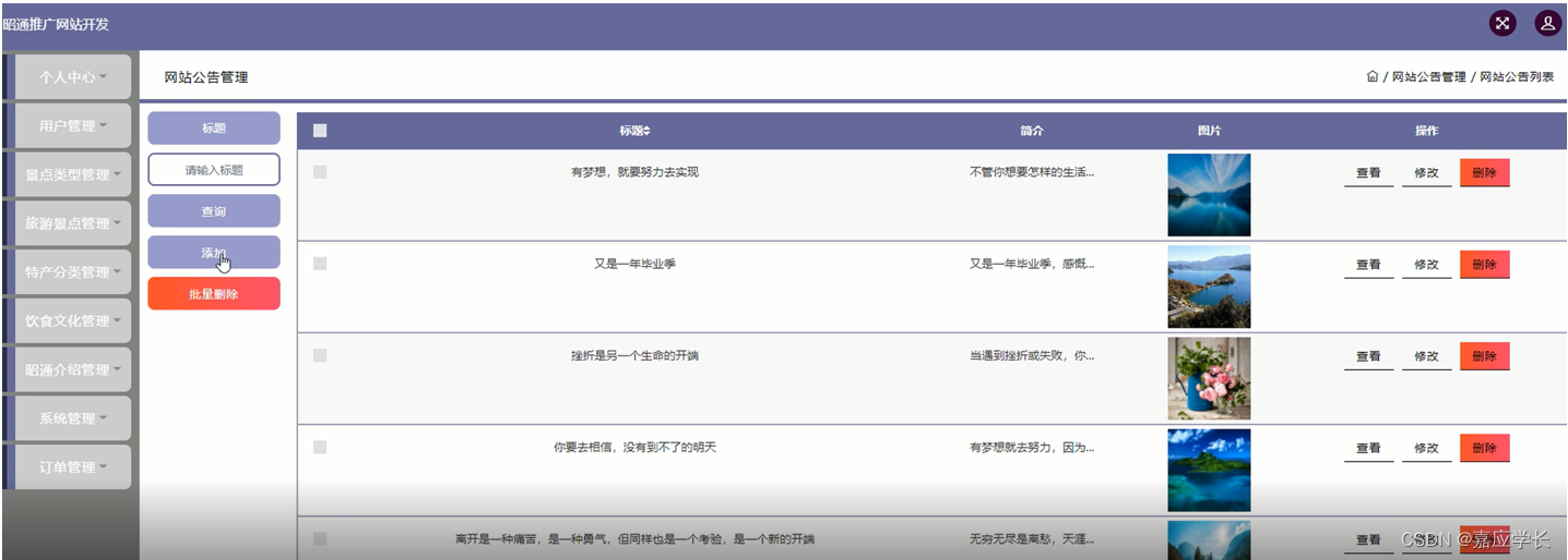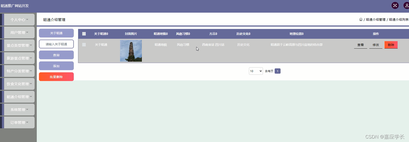 昭通介绍管理,在昭通介绍管理页面可以查看关于昭通、封面图片、昭通地貌、风俗习惯、方言、历史文化、地理位置等信息,并可根据需要对昭通介绍管理进行修改、删除等操作,如图5-6所示。