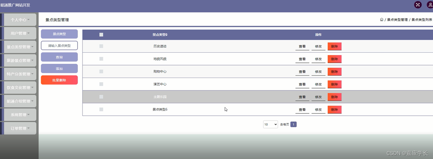 景点类型管理,在景点类型管理页面可以添加景点类型等信息,并可根据需要对景点类型管理进行修改、删除等操作,如图5-3所示。