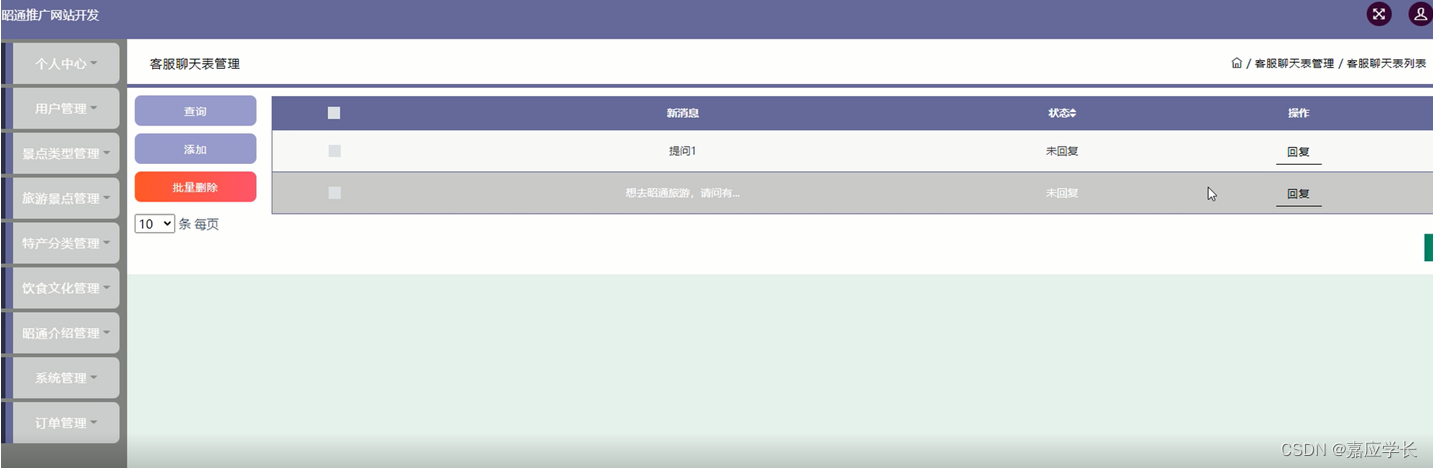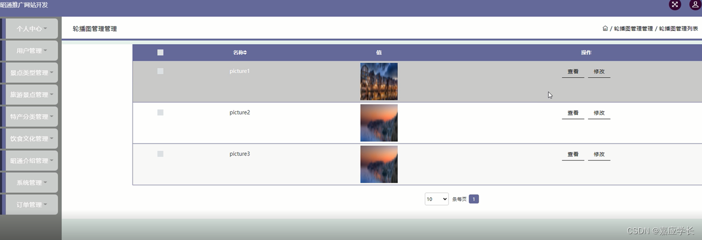 管理员通过系统管理页面查看轮播图管理、网站公告、在线客服等进行前台上传图片,网站公告发布,在线客服回复用户,进行添加、删除、修改以及查看并对整个系统进行维护等操作,如图5-7 5-8 5-9所示。