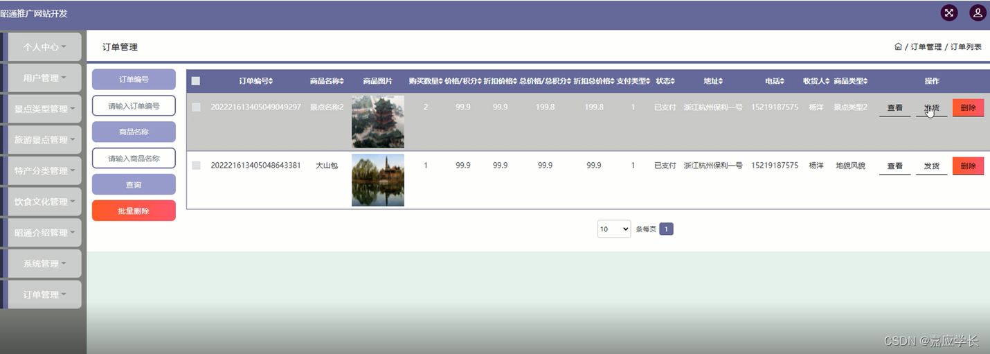 订单管理,在订单管理页面可以查看订单编号、商品名称、商品图片、购买数量、价格/积分、折扣价格、总价格/总积分、折扣总价格、支付类型、状态、地址、电话、收货人、商品类型等信息,并可根据需要对订单管理进行查看、发货、删除等操作,如图5-10所示。