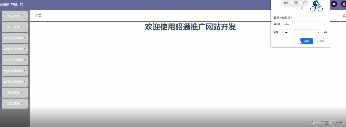 管理员登录进入昭通推广网站开发可以查看个人中心、用户管理、景点类型管理、旅游景点管理、特产分类管理、饮食文化管理、昭通介绍管理、系统管理、订单管理等内容,如图5-2所示。
