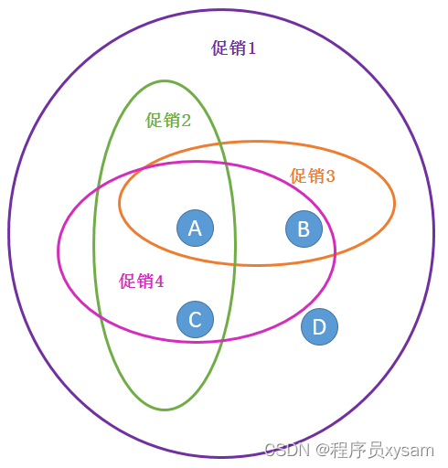 如图,【促销1】是所有商品,所有A,B,C,D四个都命中【促销1】,换句话说【促销1】的商品组中有A,B,C,D