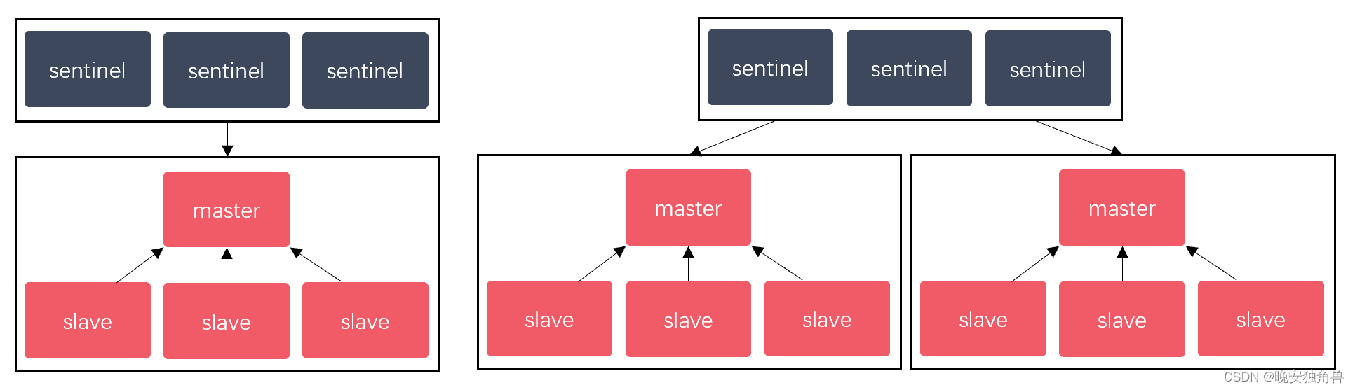 一组哨兵可以监控一个主节点,也可以同时监控多个主节点,两种情况的拓扑结构如下图:
