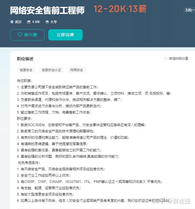 从上面两张图可以看的出来,网络安全的售前也是非常重要的并且人才紧缺的职位。不仅要懂技术,还需要对各类行业背景有所了解。