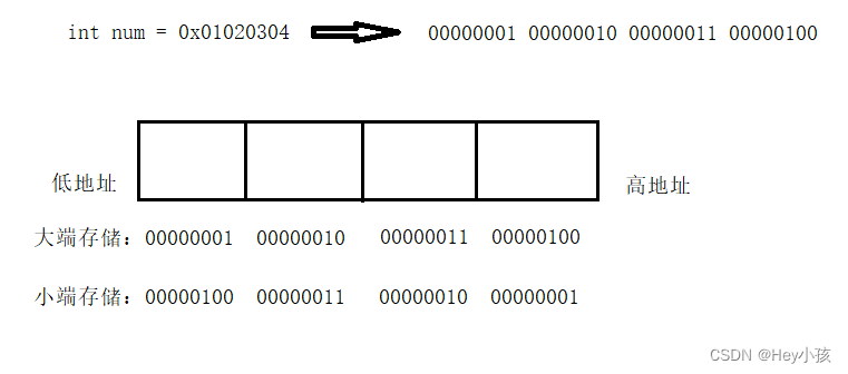 注:内存有高低地址之分,数据的二进制有高低位之分。