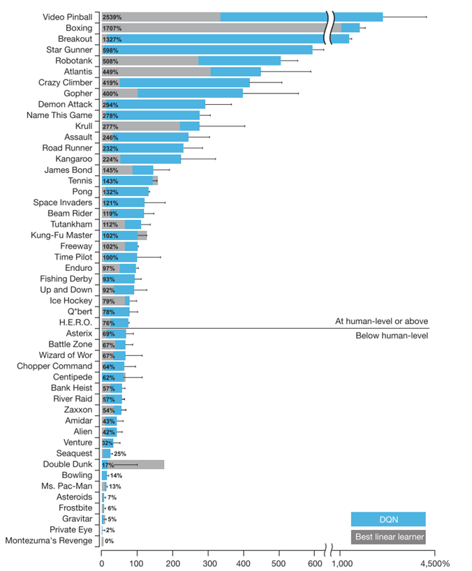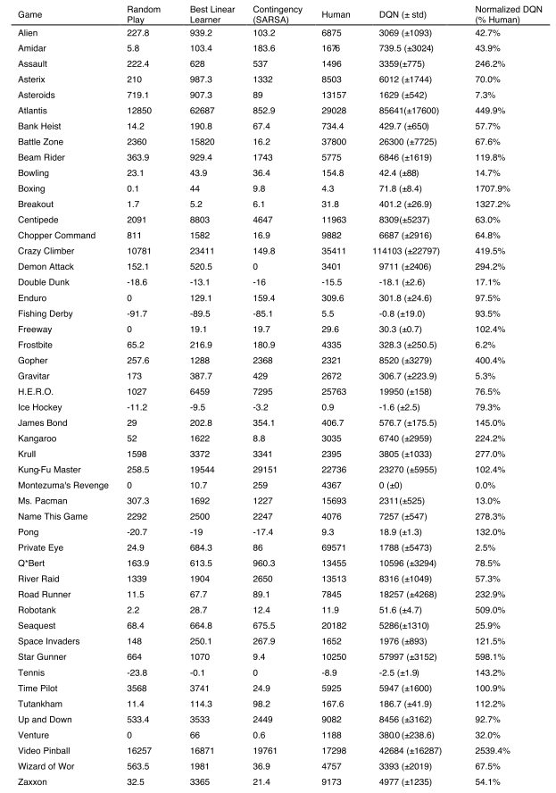 DQN智能体在49个游戏中的表现与专业人类游戏测试人员的表现不相上下,在超过一半的游戏(29个游戏)中达到了人类得分的75%以上。