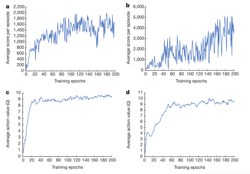 跟踪智能体平均得分和平均预测动作价值的训练曲线。a 每个点都是智能体在《太空侵略者》游戏中使用 -greedy 策略(