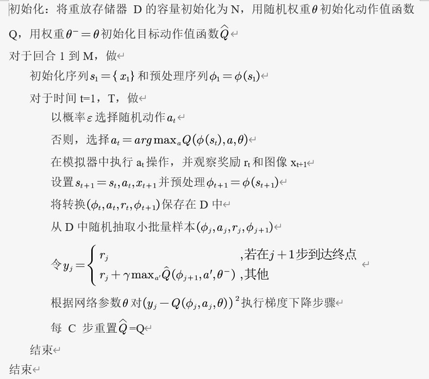 在这种技术中,我们将智能体在每个时间步的经验et=(st, at, rt, st+1)存储在数据集Dt={e1,…,et}中,并将许多回合(当达到终端状态时发生回合结束)汇集到重放记忆中。在算法的内部循环中,我们对从存储样本池中随机抽取的经验样本应用Q-learning更新或小批量更新。与标准在线Qlearning相比,这种方法有几个优点。